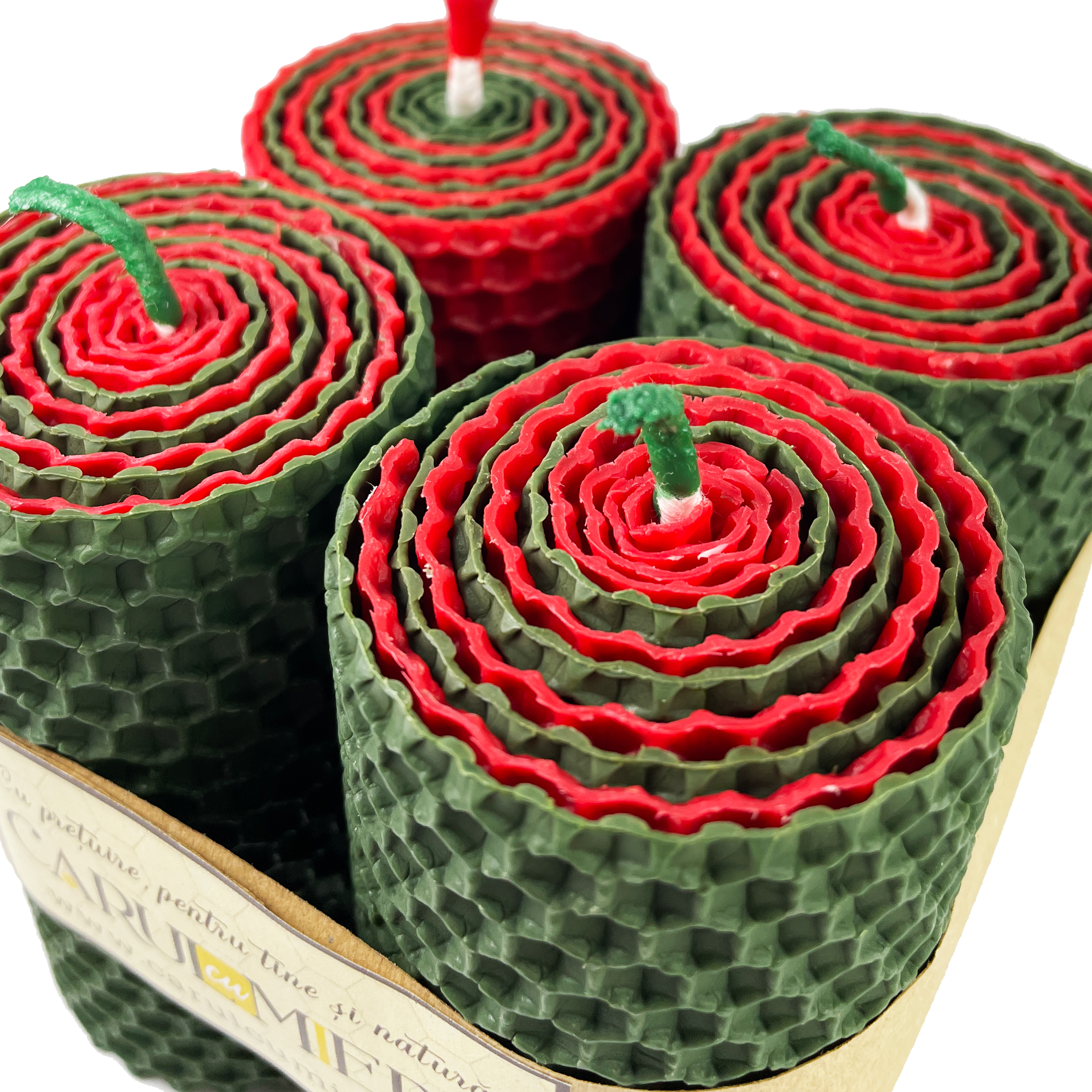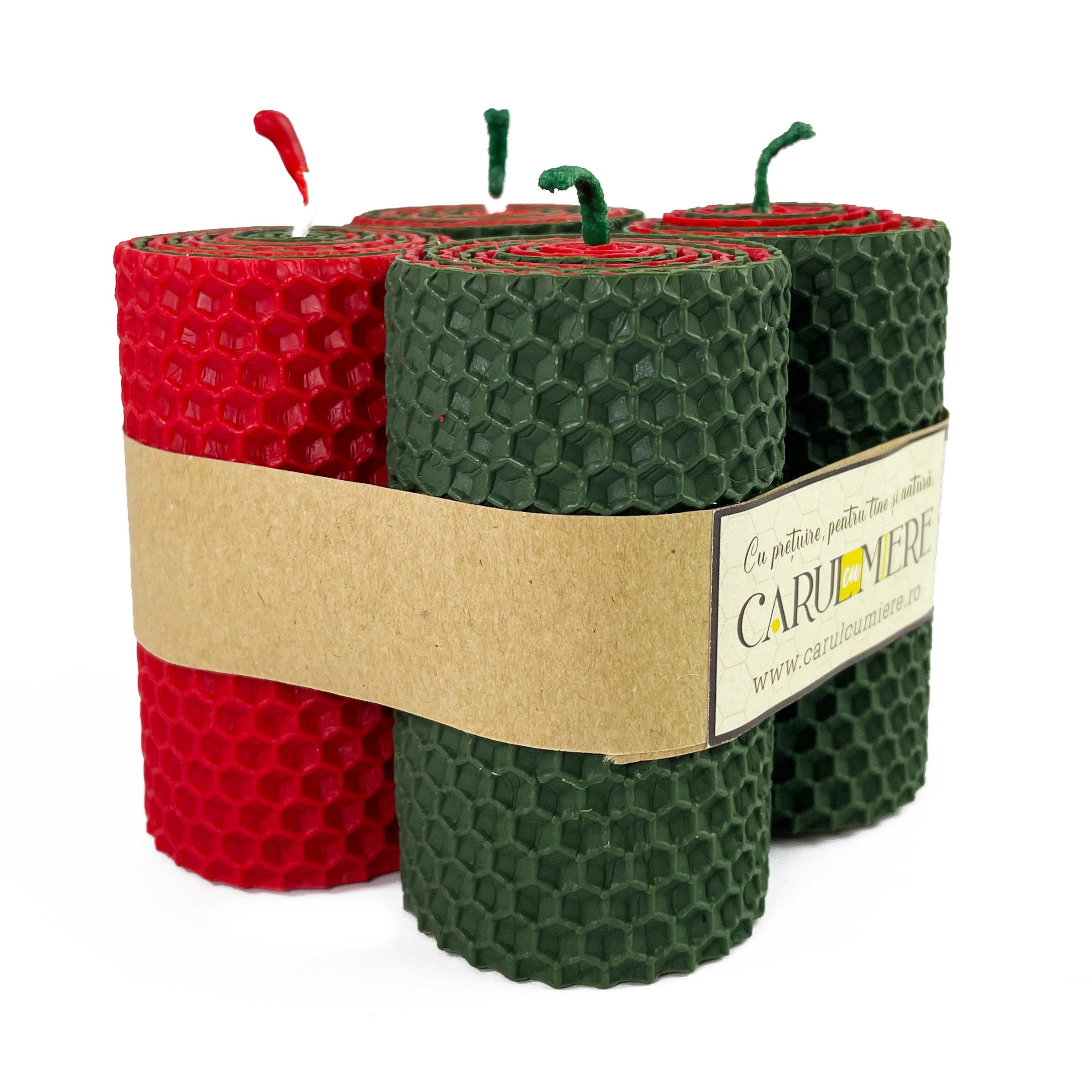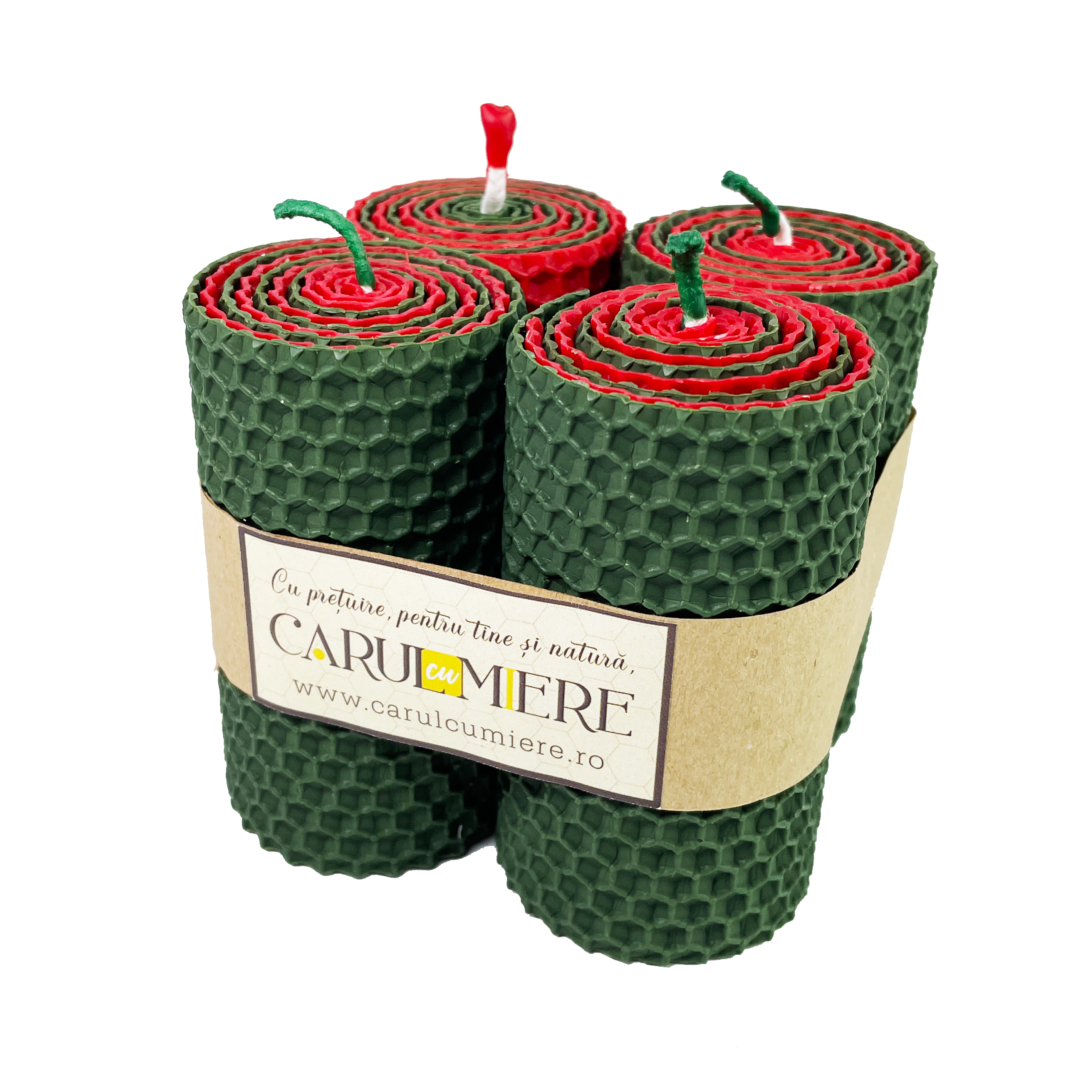Conținutul pachetului: 4 lumânări handmade din foiță de ceară naturală de albine, model fagure