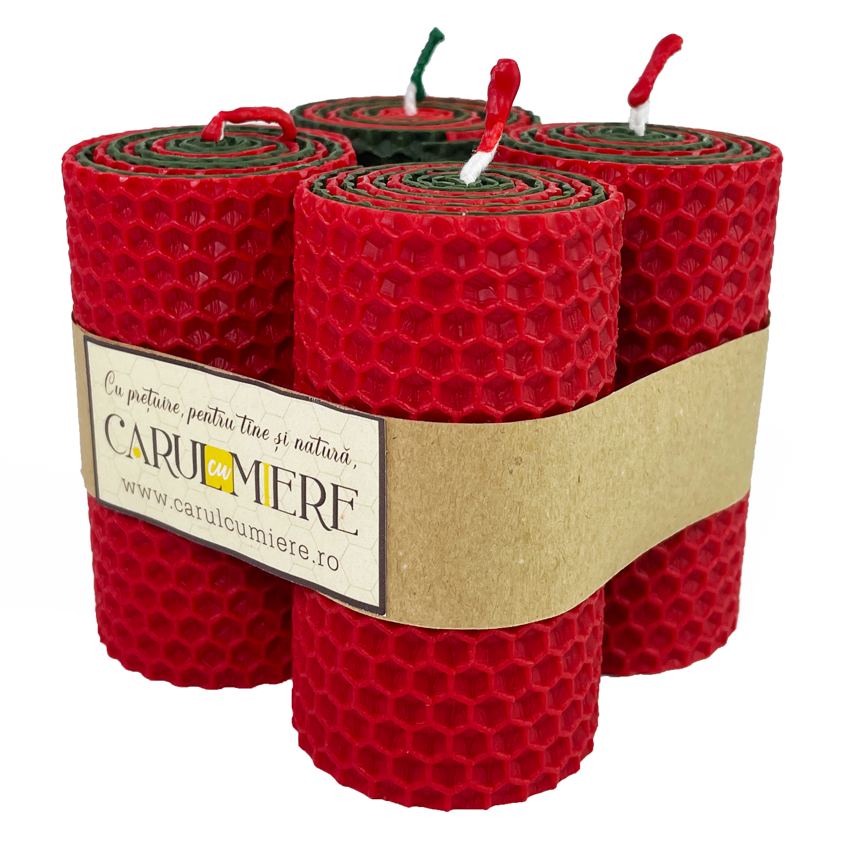 Conținutul pachetului: 4 lumânări handmade din foiță de ceară naturală de albine, model fagure