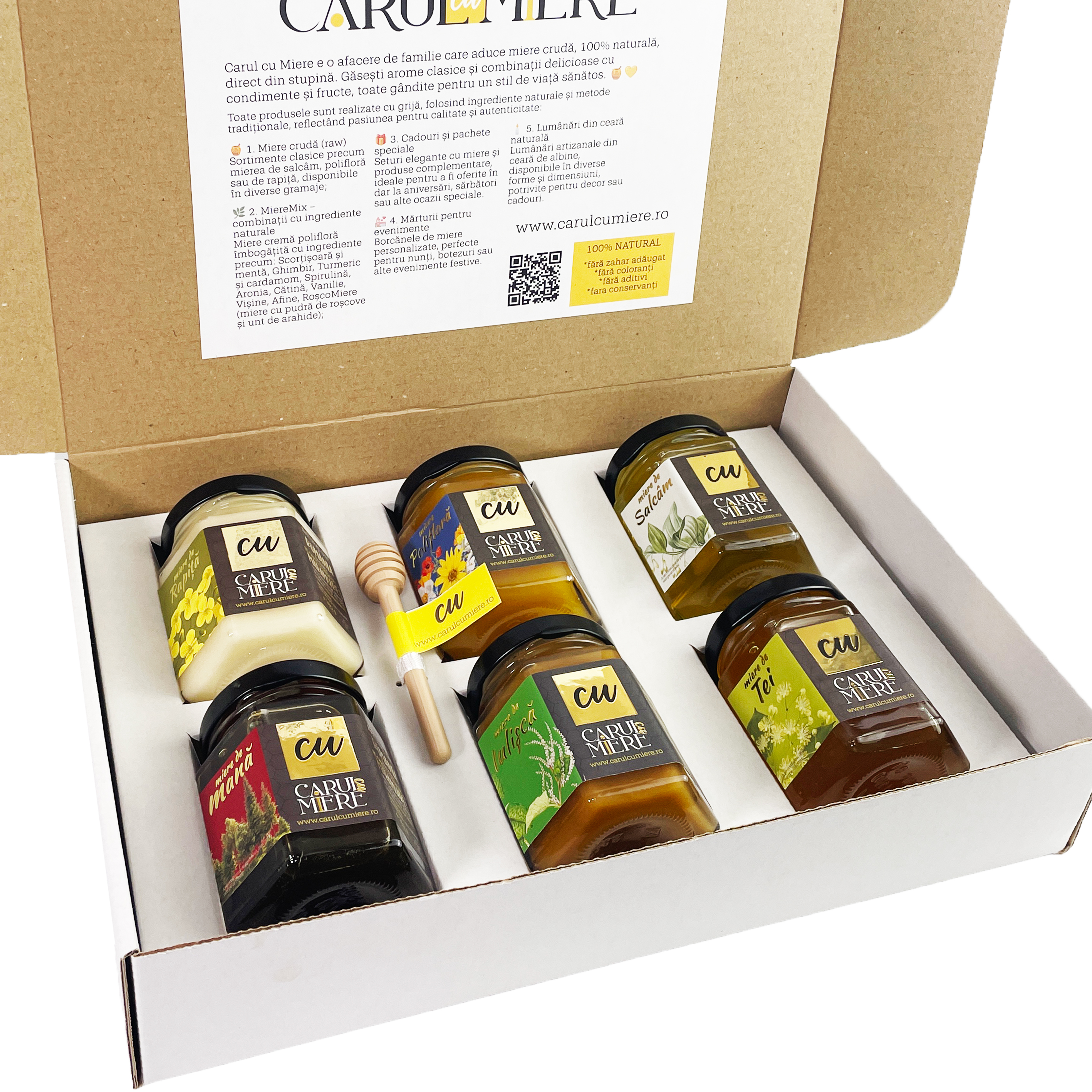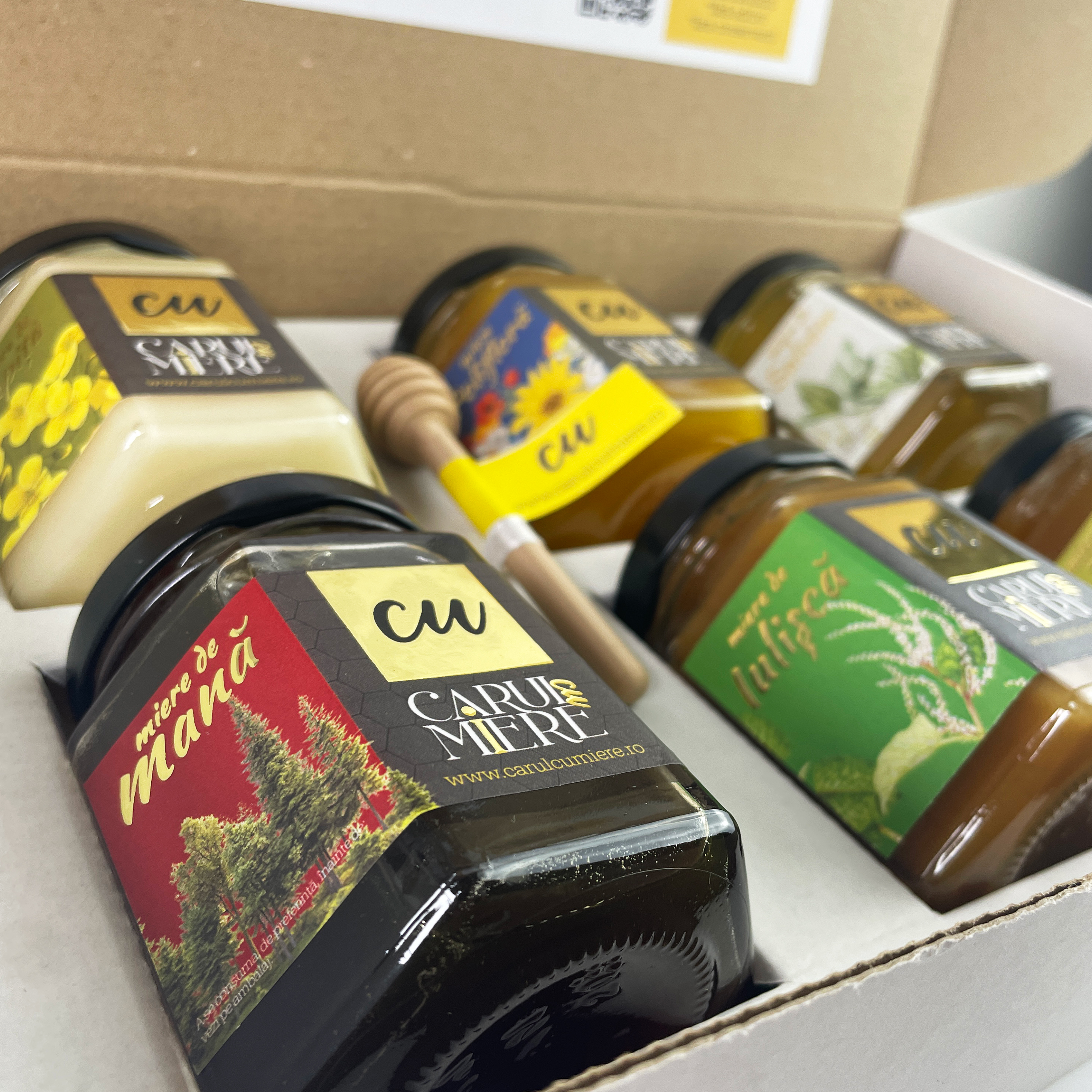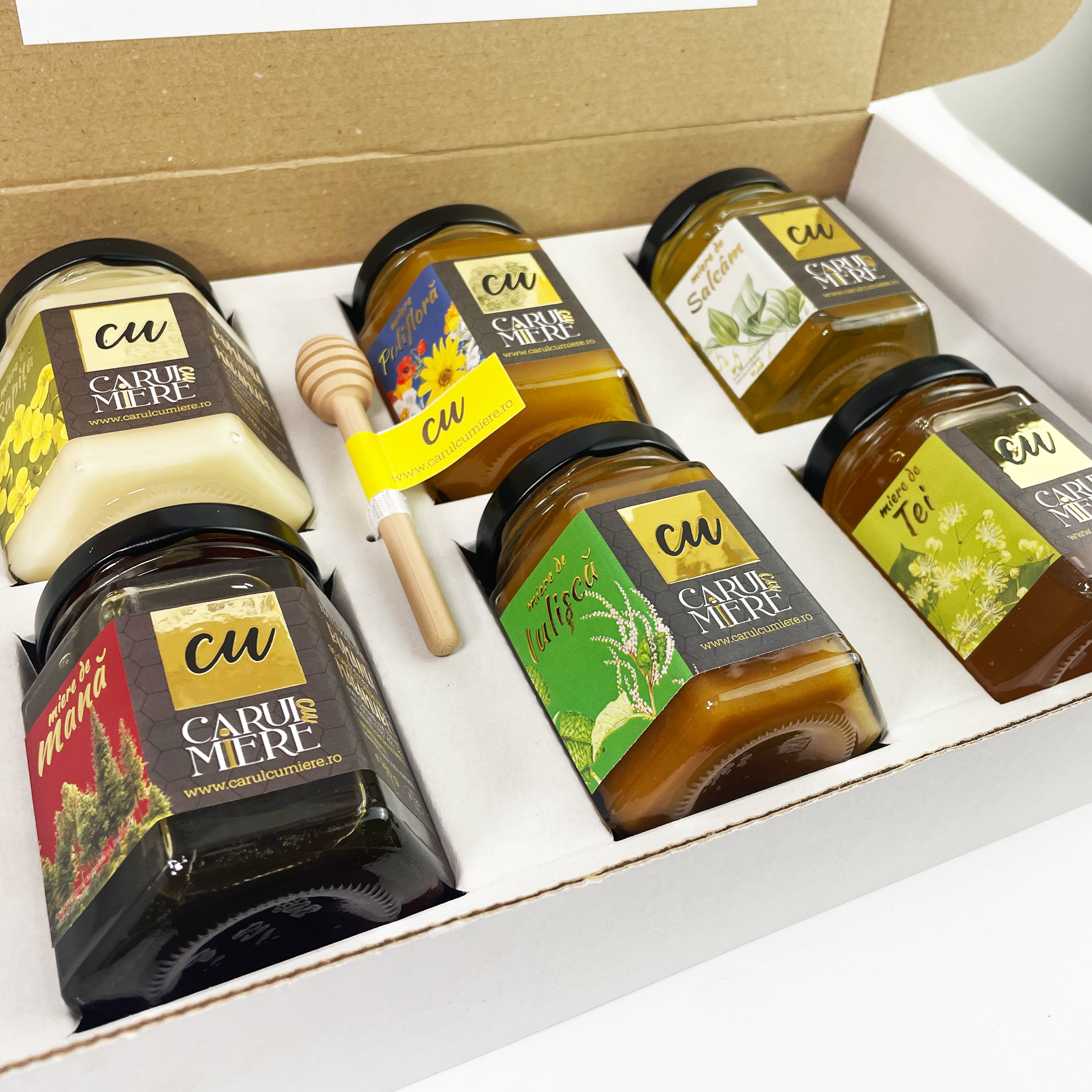 Cutia Selecție – 6 tipuri de miere crudă la alegere din gama Carul cu Miere. Alege, combină și descoperă aromele naturale ale stupului.