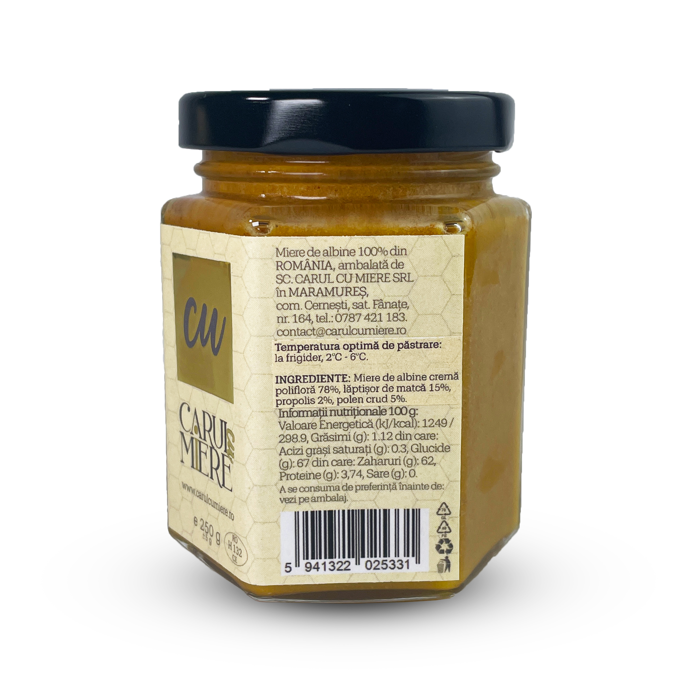 Amestec natural din miere cremă polifloră, lăptișor de matcă, polen crud și propolis. O combinație echilibrată pentru imunitate, energie și vitalitate.